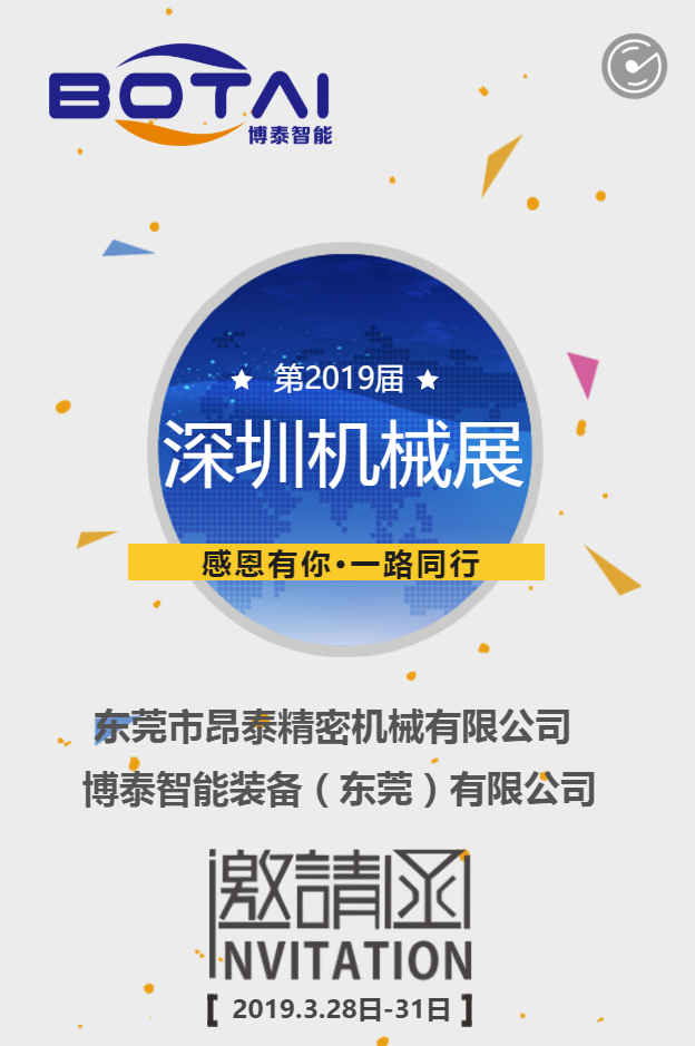 第20届深圳国际机械制造工业展览会 地址:中国.深圳会展中心 展位:8号馆 8C49 现诚邀阁下于2019年3月28日至31日莅临我司展台 参观感谢您的支持 今年会jinnianhui金字招牌智能装备(东莞)有限公司